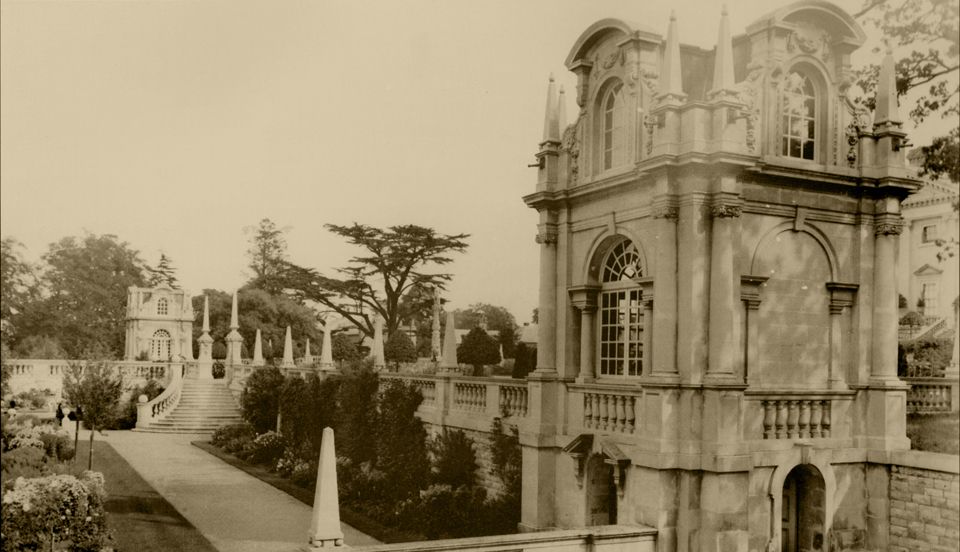 The Causeway is a continuation of the central pathway that runs from the centre of the West Front of the Mansion, bisecting the upper terrace. Created in 1895 as part of the Italianate style reconstruction of the gardens, it continues westwards at the same level above two lower, symmetrical terraces, one at either side. It concluded with a set of elaborate gates that led to two sets of stairs to the lower terraces. The outer edges of the causeway were protected by balustrades topped with obelisks. Additional flights of stone stairs descended to the lower terraces from midway along the causeway and at its start. An arched tunnel also linked the two lower terraces giving the Causeway, together with the balustrading, a bridge-like appearance.